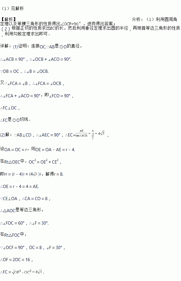 (2)若AE=4,tan∠ACD=,求FC的长.