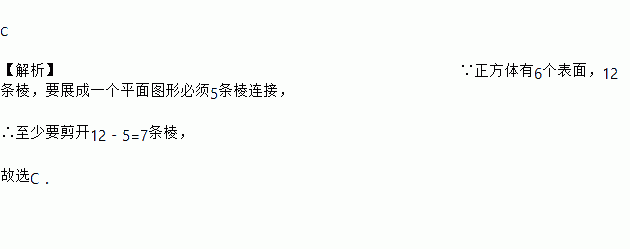 C 【解析】∵正方体有6个表面,12条棱,要展成一个平面图形必须5条棱连接, ∴至少要剪开12﹣5=7条棱, 故选C.