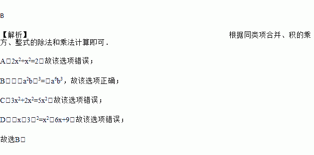 A. 2x2÷x2=2x B. (﹣a2b)3=﹣a6b3 C. 3x2+2x2=5x4 D. (x﹣3)2=x2﹣9