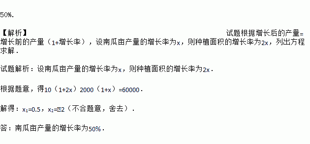 某农场去年种植南瓜 10 亩,总产量 20000kg,今年该农场扩大了种植面积,并引进了新品种,使产量增长到 60000kg,已知今年种植面积的增长率是今年平均亩产量增长率的 2 倍,求今年平均亩产量的增长率.