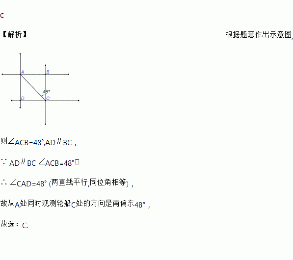 轮船航行到处观测小岛的方向是北偏西,那么从同时观测轮船的方向是( )
