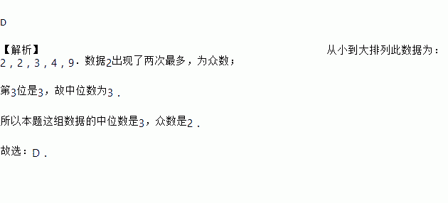 学校开展为贫困地区捐书活动,以下是5名同学捐书的册数:2,2,3,4,9. 则这组数据的中位数和众数分别是( )