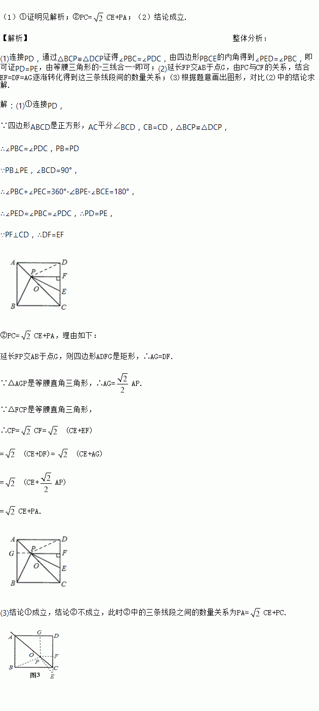 £¨2£©ÈôµãPÔÚÏß¶ÎOCÉÏ£¨²»ÓëµãO¡¢CÖØºÏ£©£¬PE¡ÍPBÇÒPE½»Ö±ÏßCDÓÚµãE£®ÇëÍê³Éͼ3²¢Åжϣ¨1£©ÖеĽáÂÛ¢Ù¡¢¢ÚÊÇ·ñ·Ö±ð³ÉÁ¢£¿Èô²»³ÉÁ¢£¬Ð´³öÏàÓ¦µÄ½áÂÛ£®£¨Ëùд½áÂÛ¾ù²»±ØÖ¤Ã÷£©