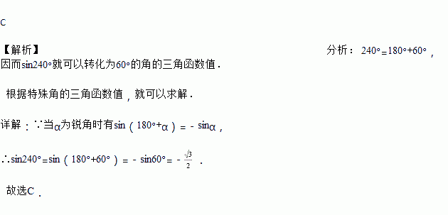 ,所以sin225°=sin(180°+45°)=﹣sin45°,由此猜想,推理知:一般地当α为锐角时有sin(180°+α)=﹣sinα,由此可知:sin240°=( )