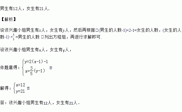 某兴趣小组进行活动,每个男生都头戴蓝色帽子,每个女生都头戴红色帽子.帽子戴好后,每个男生都看见戴红色帽子的人数比戴蓝色帽子的人数的2倍少1,而每个女生都看见戴蓝色帽子的人数是戴红色帽子的人数的
