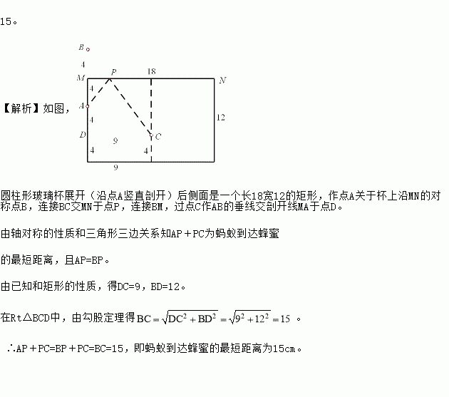 处有一滴蜂蜜,此时一只蚂蚁正好在杯外壁,离杯上沿4cm与蜂蜜相对的点A处,则蚂蚁到达蜂蜜的最