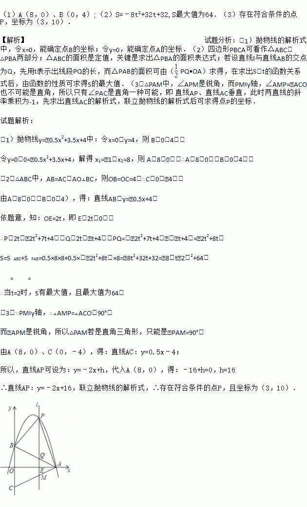 (2)若一条与y轴重合的直线l以每秒2个单位长度的速度向右平移,分别交线段OA、CA和抛物线于点E、M和点P,连接PA、PB.设直线l移动的时间为t(0<t<4)秒,求四边形PBCA的面积S(面积单位)与t(秒)的函数关系式,并求出四边形PBCA的最大面积;