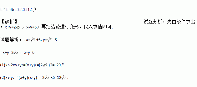 (1)36;(2)12 【解析】试题分析:先由条件求出:x+y=2,x-y=6;再把结论进行变形,代入求值即可. 试题解析:∵x=+3, y=-3 ∴x+y=2,x-y=6 (1)x2-2xy+y2=(x+y)2=(2)2="20," (2)x2-y2="(x+y)(x-y)=" 2×6=12.