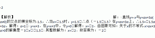 如图,直线y=-x与y=ax+3a(a≠0)的交点的横坐标为-1.5,则关于x的不等式-x>ax+3a>0的整数解为________。
