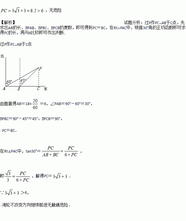 如图,海上有一灯塔P,在它周围6海里内有暗礁.一艘海轮以18海里/时的速度由西向东方向航行,行至A点处测得灯塔P在它的北偏东60°的方向上,继续向东行驶20分钟后,到达B处又测得灯塔P在它的北偏东45°方向上,如果海轮不改变方向继续前进有没有触礁的危险?