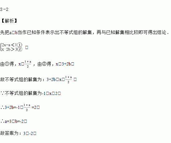 不等式组的解集为﹣1<x<2,则a=________ ,b=________