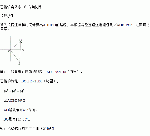在B港有甲、乙两艘渔船,若甲船沿北偏东60°的方向以每小时8海里的速度前进,乙船沿南偏东某个角度的方向以每小时15海里的速度前进,2小时后,甲船到M岛,乙船到P岛,两岛相距34海里,你知道乙船是沿哪个方向航行的吗?