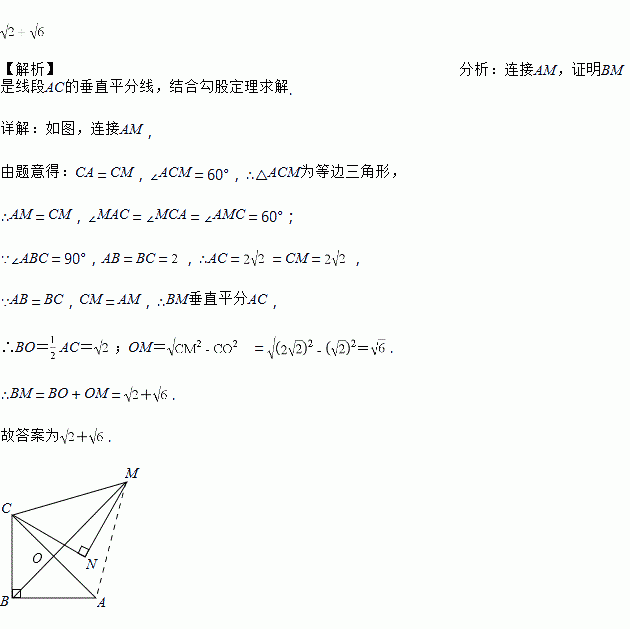 如图,在Rt△ABC中,∠ABC=90°,AB=BC=2.将△ABC绕点C逆时针旋转60°,得到△MNC,连结BM,则BM的长是__________.