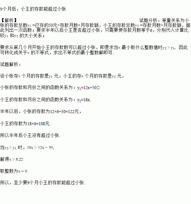 小张准备将平时的零用钱节约一些储存起来.他已存有50元,从现在起每个月节存12元.小张的同学小王以前没有存过零用钱,听到小张在存零用钱,表示从小张存款当月起每个月存18元,争取超过小张.请你写出小张和小王存款和月份之间的函数关系,并计算半年以后小王的存款是多少,能否超过小张?至少几个月后小王的存款能超过小张?