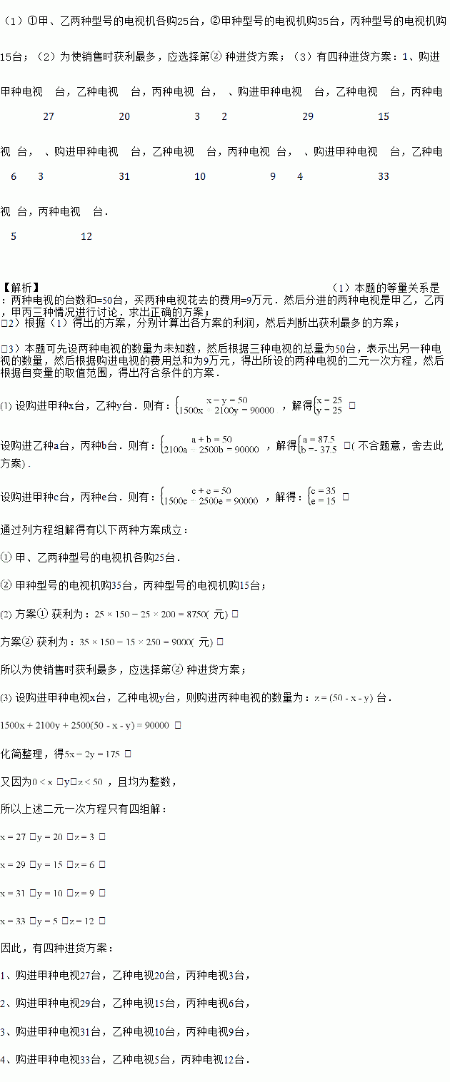 计划拨款9万元从厂家购进50台电视机已知该厂家生产三种不同型号的电视机,出厂价分别为:甲种每台1500元,乙种每台2100元,丙种每台2500元.![]()