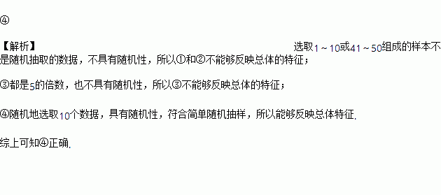 ①选取1~10组成样本;②选取41~50组成样本;③选取末尾是0和5的组成样本;④随机地选取10个个体组成样本.