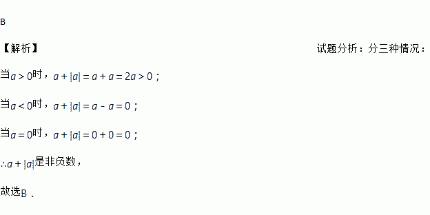 B 【解析】试题分析:分三种情况: 当a>0时,a+|a|=a+a=2a>0; 当a<0时,a+|a|=a-a=0; 当a=0时,a+|a|=0+0=0; ∴a+|a|是非负数, 故选B.