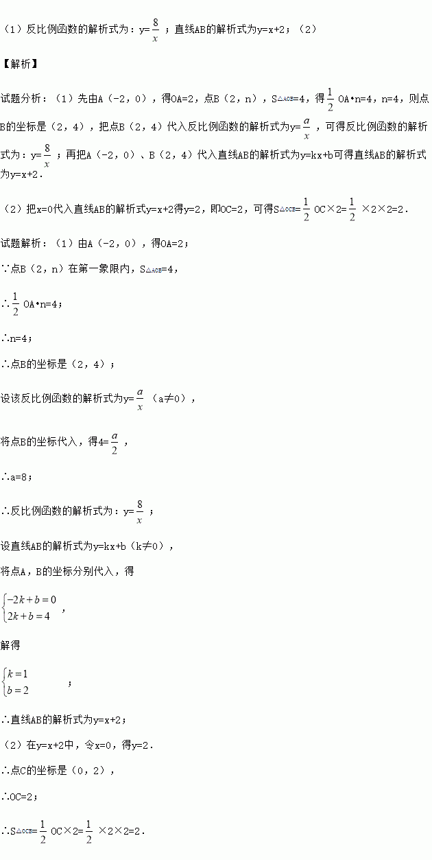 已知:如图,在平面直角坐标系xOy中,直线AB与x轴交于点A(-2,0),与反比例函数在第一象限内的图象的交于点B(2,n),连结BO,若S△AOB=4.