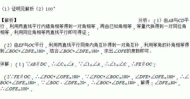如图,AB∥DC,AC和BD相交于点O,E是CD上一点,F是OD上一点,且∠1=∠A.