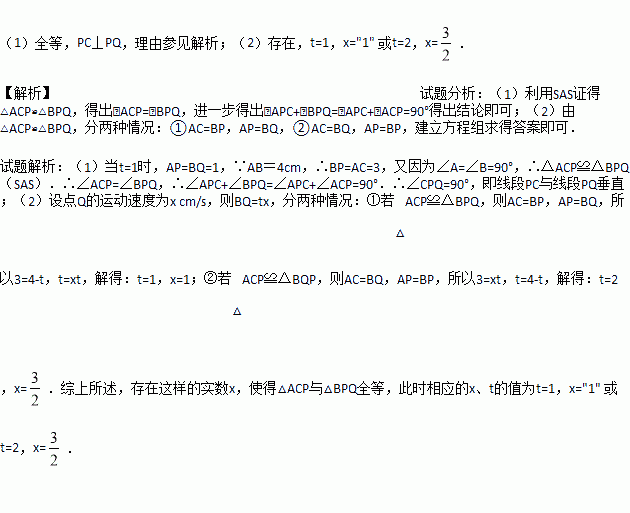 如图(1),AB=4cm,AC⊥AB,BD⊥AB,AC=BD=3cm.点P在线段AB上以1cm/s的速度由点A向点B运动,同时,点Q在线段BD上由点B向点D运动.它们运动的时间为t(s).