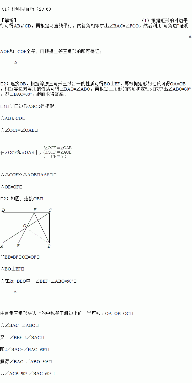 如图,在矩形ABCD中,E、F分别是边AB、CD上的点,AE=CF,连接EF、BF,EF与对角线AC交于点O,且BE=BF,∠BEF=2∠BAC.