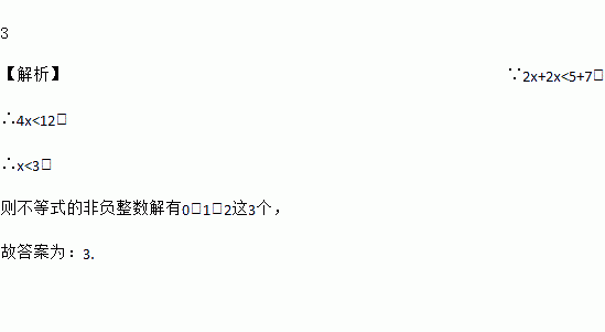 不等式2x﹣7<5﹣2x的非负整数解的个数为__个.