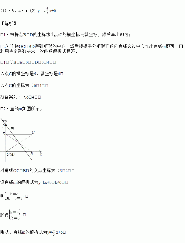 (2) 已知直线m经过点P(0,6)且把矩形ABCD分成面积相等的两部分,请只用直尺准确地画出直线m,并求该直线m的解析式.