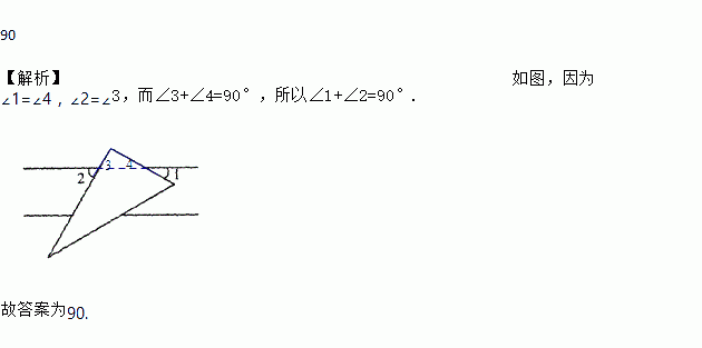 一块直角三角板放在两平行直线上,如图所示,∠1+∠2=__________°.