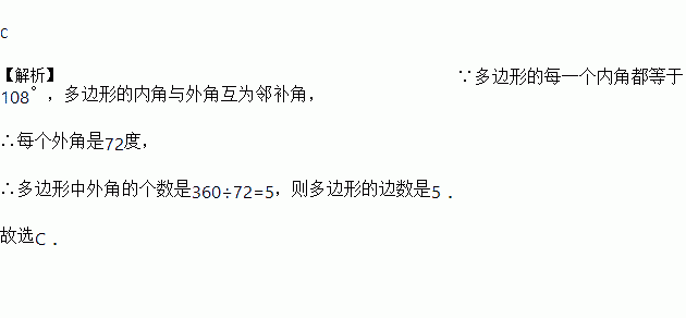 已知正多边形的每个内角均为108°,则这个正多边形的边数为( )