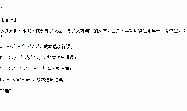 C 【解析】 试题分析:根据同底数幂的乘法,幂的乘方与积的乘方,合并同类项运算法则逐一计算作出判断: A、x•x2=x1+2=x3≠x2,故本选项错误; B、(xy)2=x2y2≠xy2,故本选项错误; C、(x2)3=x2×3=x6,故本选项正确; D、x2+x2=2x2=x4,故本选项错误。 故选C。