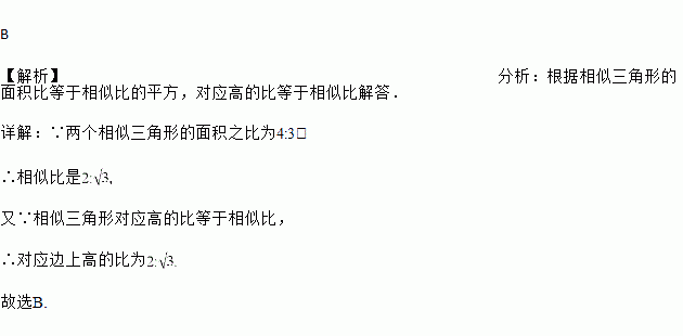 两个相似三角形面积的比为4∶3,那么它们的对应边上的高的比为( )