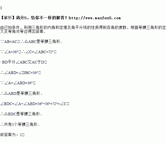 如图,在ΔABC中,∠A=36°,AB=AC,BD平分∠ABC,则图中等腰三角形的个数是__________
