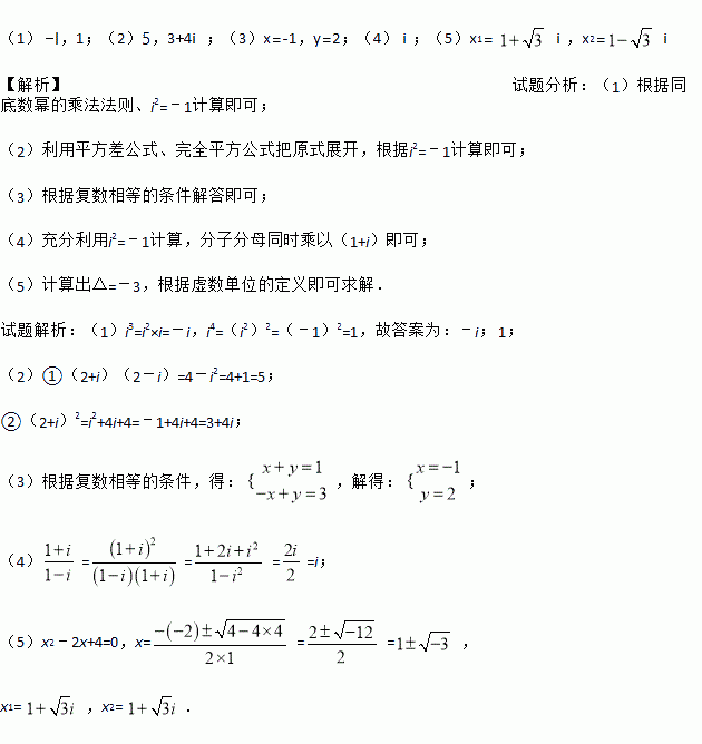 (1) -I,1;(2)5,3+4i ;(3)x=-1,y=2;(4) i ;(5)x1= i ,x2= i 【解析】试题分析:(1)根据同底数幂的乘法法则、i2=﹣1计算即可; (2)利用平方差公式、完全平方公式把原式展开,根据i2=﹣1计算即可; (3)根据复数相等的条件解答即可; (4)充分利用i2=﹣1计算,分子分母同时乘以(1+i)即可; (5)计算出△=-...