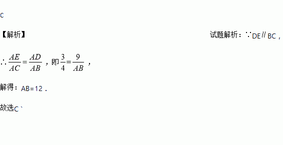如图,在△ABC中,点D、E分别在AB、AC边上,DE∥BC.若AE:AC=3:4,AD=9,则AB等于( )