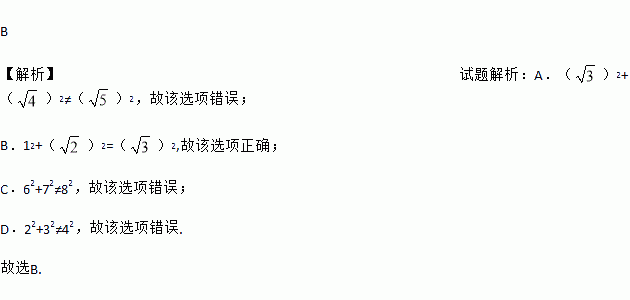 B 【解析】试题解析:A.()2+()2≠()2,故该选项错误; B.12+()2=()2,故该选项正确; C.62+72≠82,故该选项错误; D.22+32≠42,故该选项错误. 故选B.