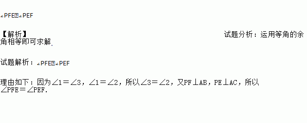 如图,P为∠BAC内一点,PE⊥AC于E,PF⊥AB于F,连接EF,并延长至D,若∠1=∠2,判断∠PFE与∠PEF的大小关系,并说明理由.