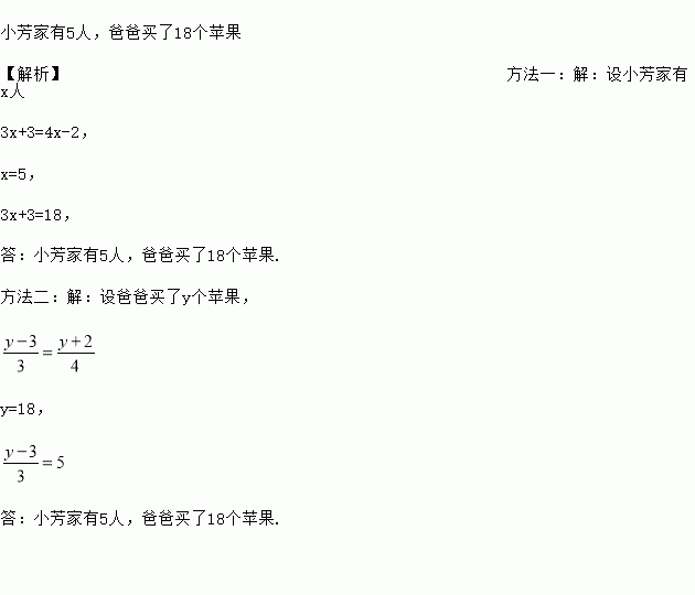 爸爸买了一箱苹果回家,小芳想分给家里的每一个人,如果每人分3个,就剩下3个苹果分不完,如果每人分4个,则还差2个苹果才够分,问小芳家有几个人?爸爸买了多少个苹果?