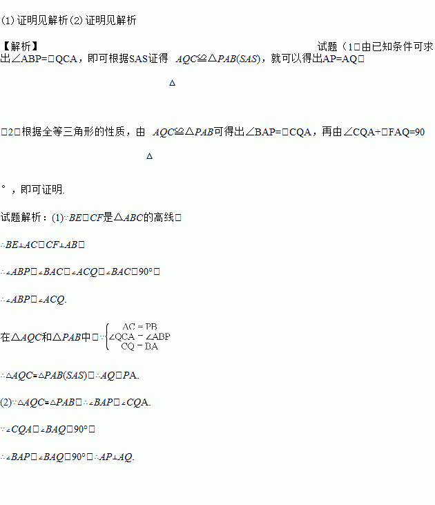 如图,已知在△ABC中,AB>AC,BE,CF都是△ABC的高线,P是BE上一点,且BP=AC,Q是CF延长线上一点,且CQ=AB,连结AP,AQ,QP.求证:
