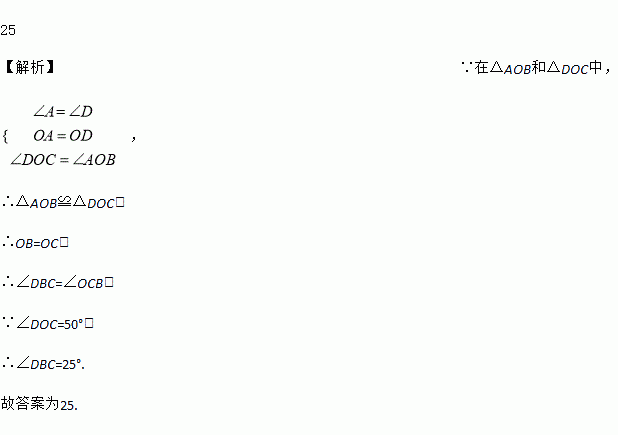 如图,∠A =∠D , OA=OD, ∠DOC=50°,则∠DBC=________度.