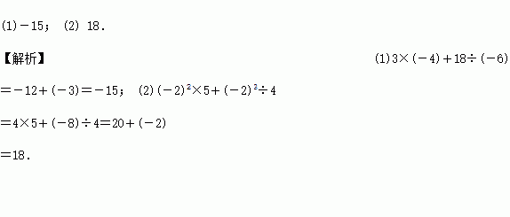 计算:(1) 3×(-4)+18÷(-6) (2) (-2)2×5+(-2)3÷4.