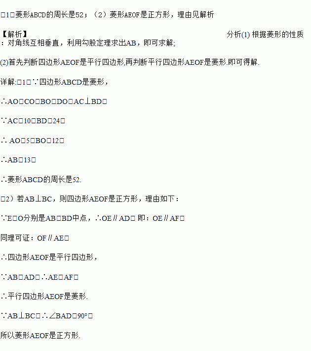 (1)若AC=10,BD=24,求菱形ABCD的周长;