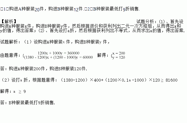 (2)第二次以原价购进A、B两种服装,购进B服装的件数不变,购进A服装的件数是第一次的2倍,A种服装按原价出售,而B种服装打折销售;若两种服装销售完毕,要使第二次销售活动获利不少于8160元,则B种服装最低打几折销售?