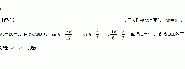 如图,已知菱形ABCD中,AE⊥BC于点E.若sin B=,AD=6,则菱形ABCD的面积为( )