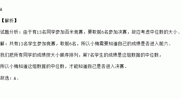 A 【解析】 试题分析:由于有13名同学参加百米竞赛,要取前6名参加决赛,故应考虑中位数的大小. 【解析】 共有13名学生参加竞赛,取前6名,所以小梅需要知道自己的成绩是否进入前六. 我们把所有同学的成绩按大小顺序排列,第7名学生的成绩是这组数据的中位数, 所以小梅知道这组数据的中位数,才能知道自己是否进入决赛. 故选:A.