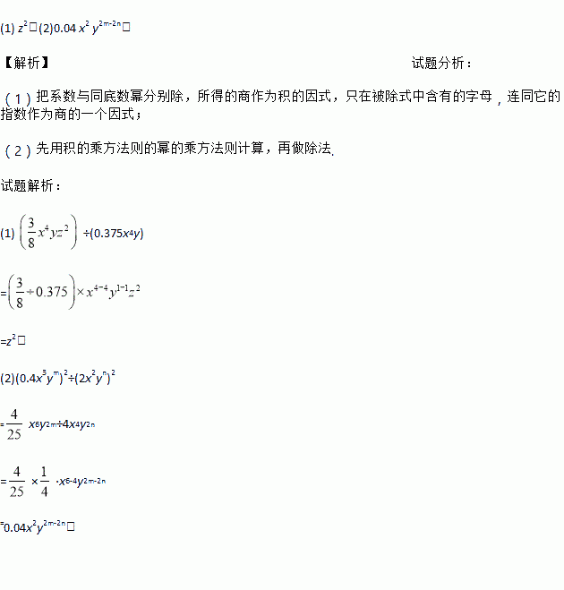 计算: (1) ÷(0.375 x4y); (2)(0.4 x3 ym)2÷(2 x2yn)2。