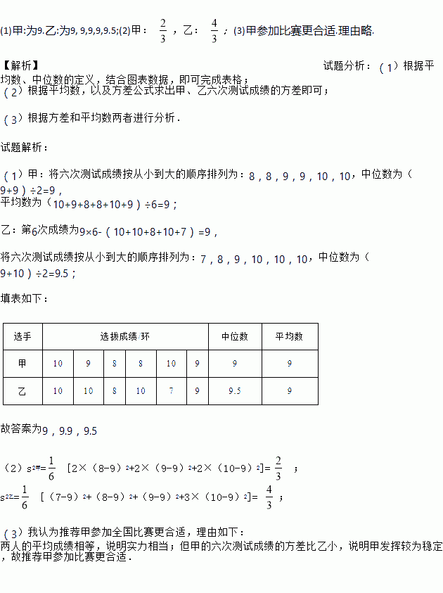 市射击队为从甲、乙两名运动员中选拔一人参加省比赛,对他们进行了六次测试,测试成绩如表: