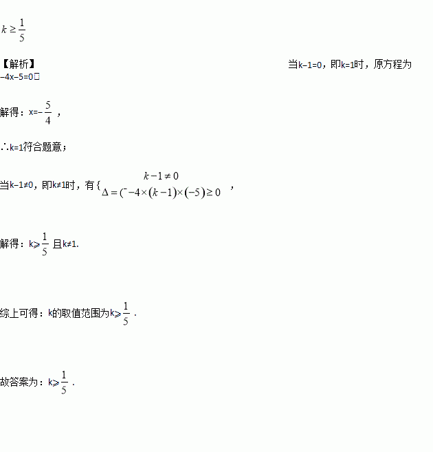 若关于x的方程(k-1)x2-4x-5=0 有实数根, 则k 的取值范围是______.