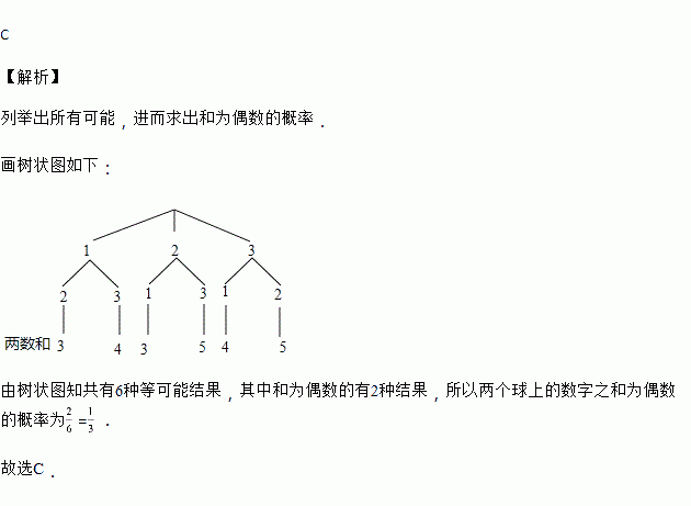 有大小、形状、颜色完全相同的3个乒乓球,每个球上分别标有数字1,2,3中的一个,将这3个球放入不透明的袋中搅匀,如果不放回的从中随机连续抽取两个,则这两个球上的数字之和为偶数的概率是( )