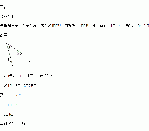 如图,已知∠1=75°,∠2=35°,∠3=40°,则直线a与b的位置关系是______.