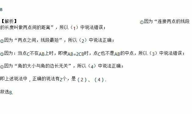 B 【解析】①因为“连接两点的线段的长度叫做两点间的距离”,所以(1)中说法错误; ②因为“两点之间,线段最短”,所以(2)中说法正确; ③因为:当点C不在AB上时,即使AB=2CB时,点C也不是AB的中点,所以(3)中说法错误; ④因为“角的大小与角的边长无关”,所以(4)中说法正确; 即上述说法中,正确的说法有2个,是(2)、(4). 故选B.